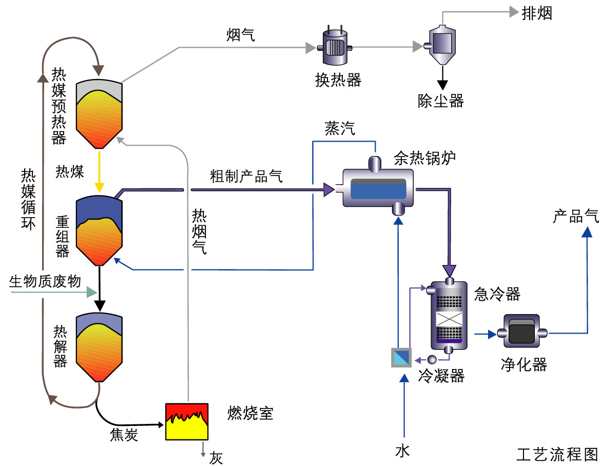 我国垃圾处理面临的常见问题,垃圾源头分类尚未实施,源头垃圾混合收集还会持续相当长的一段时间,垃圾成份复杂;目前中国垃圾处理主要采取传统焚烧方式,由于中国垃圾湿度大,热值低。因此传统焚烧处理时需借助油、天然气或煤或生物质等帮助然烧,消耗其它不可再生能源;传统焚烧方式排烟量大,且很难能符环保要求,特别是传统焚烧过程中产生的二恶英等有害气体处理不当就会造成环境污染; 二、热解气化处理技术基本原理 生活垃圾的有机成分主要是生物质及塑料等,通过清洁高效的热解气化系统,用较低的能耗产生高品质、中热值的燃气,直接供用户使用或通过燃气发电设备转换成电能。 生活垃圾热解气化发电可以改善固废处理方式,有效控制垃圾处理过程中的二次污染。 三、生活垃圾热解气化工艺流程 ![]() 四、热解气化系统的特点 1.热解和燃烧过程同时进行,通过热解所剩焦炭的燃烧为热解过程供给热量。系统具有自持性。 2.热解是在无氧及无水蒸气的状态下进行的,产生燃气热值高。热解燃气和热解焦炭燃烧产生的烟气是分离的,品质易于控制 3.使用单一粒径的陶瓷颗粒或者经过筛分的炉渣做为传热介质,避免了的结焦、腐蚀等问题; 4.移动床内的传热介质主要通过重力及机械提升运动,容易控制,可靠性高。 |